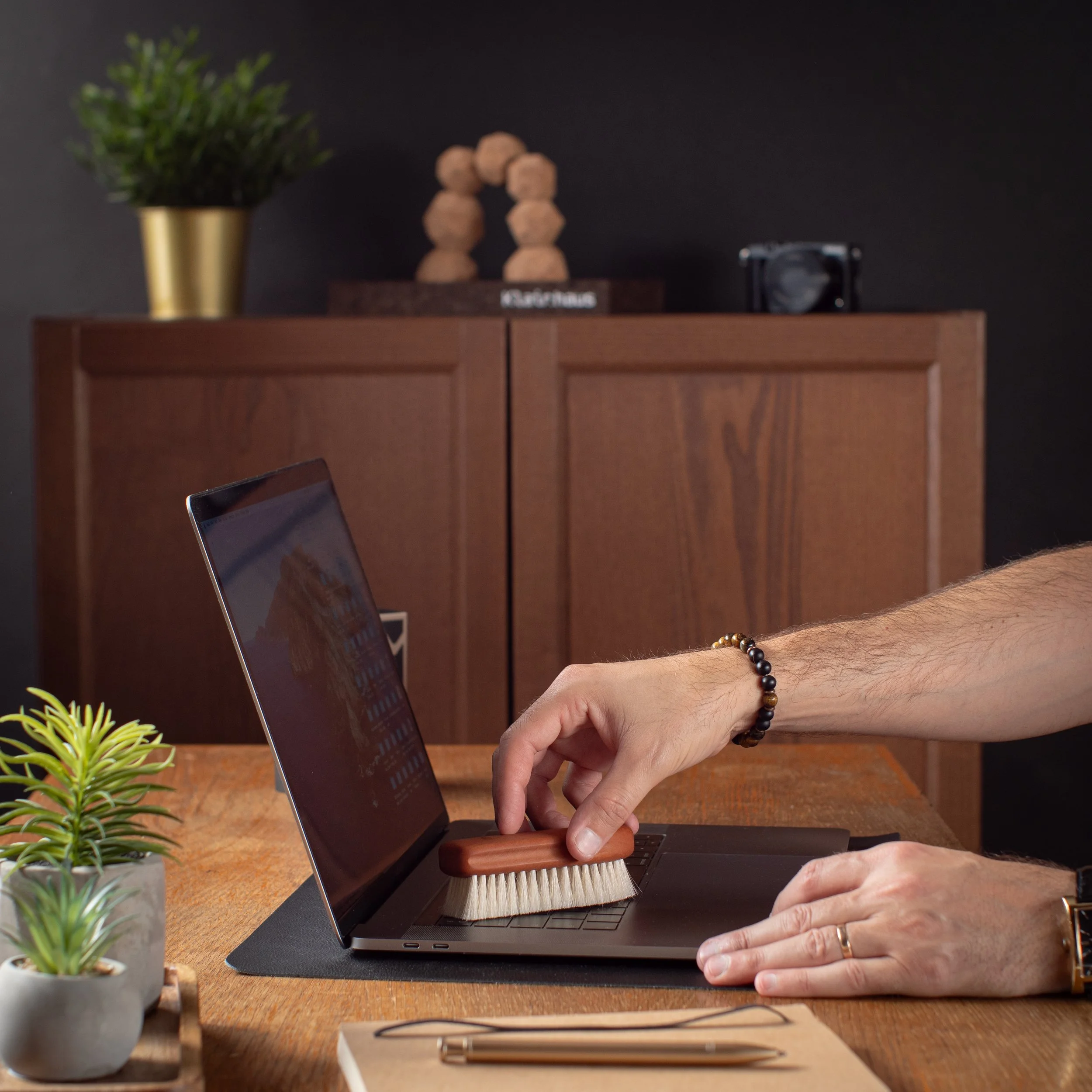 The goat hair bristles generate static naturally, lifting dust from keyboards, screens, and lenses without scratching.